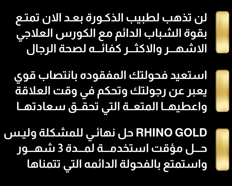 علي عكس المنتجات التقليدية المؤقتة التي تحتاج لها في كل مرة ! كريم RHINO GOLD هي حل جذري ونهائي لمشكلة الضعف عند الرجال فقط استخدمة لمدة 3 شهور واستمتع بقوة الشباب والفحولة الدائمه التي تتمناها